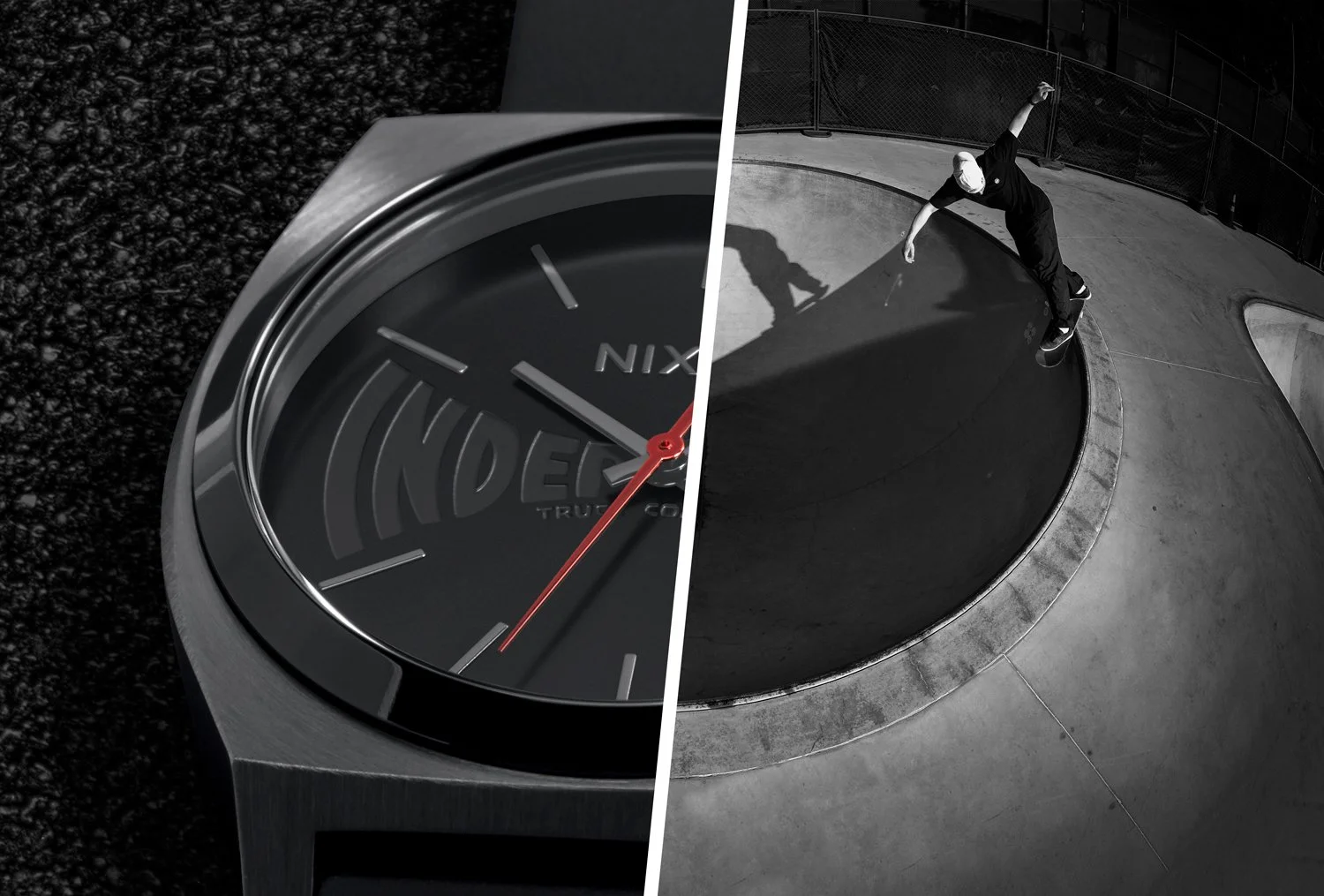 A split image showing a close-up of an Nixon wristwatch on the left and a skateboarder performing a trick in a skatepark on the right.