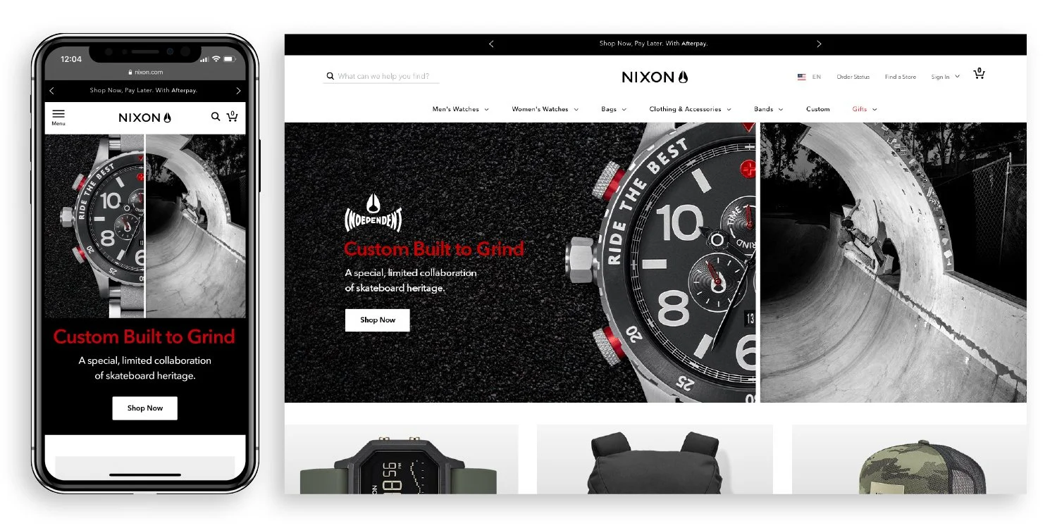 A split-screen image showing a mobile phone on the left and a desktop website on the right, both displaying the Nixon online store featuring watches and lifestyle accessories.